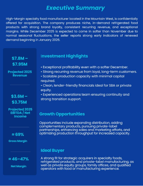 Wright Business Advisors is pleased to announce the confidential listing of a high-margin specialty food manufacturer located in the Mountain West. This company is a standout opportunity for acquisition, boasting exceptional profitability and a strong, loyal brand.